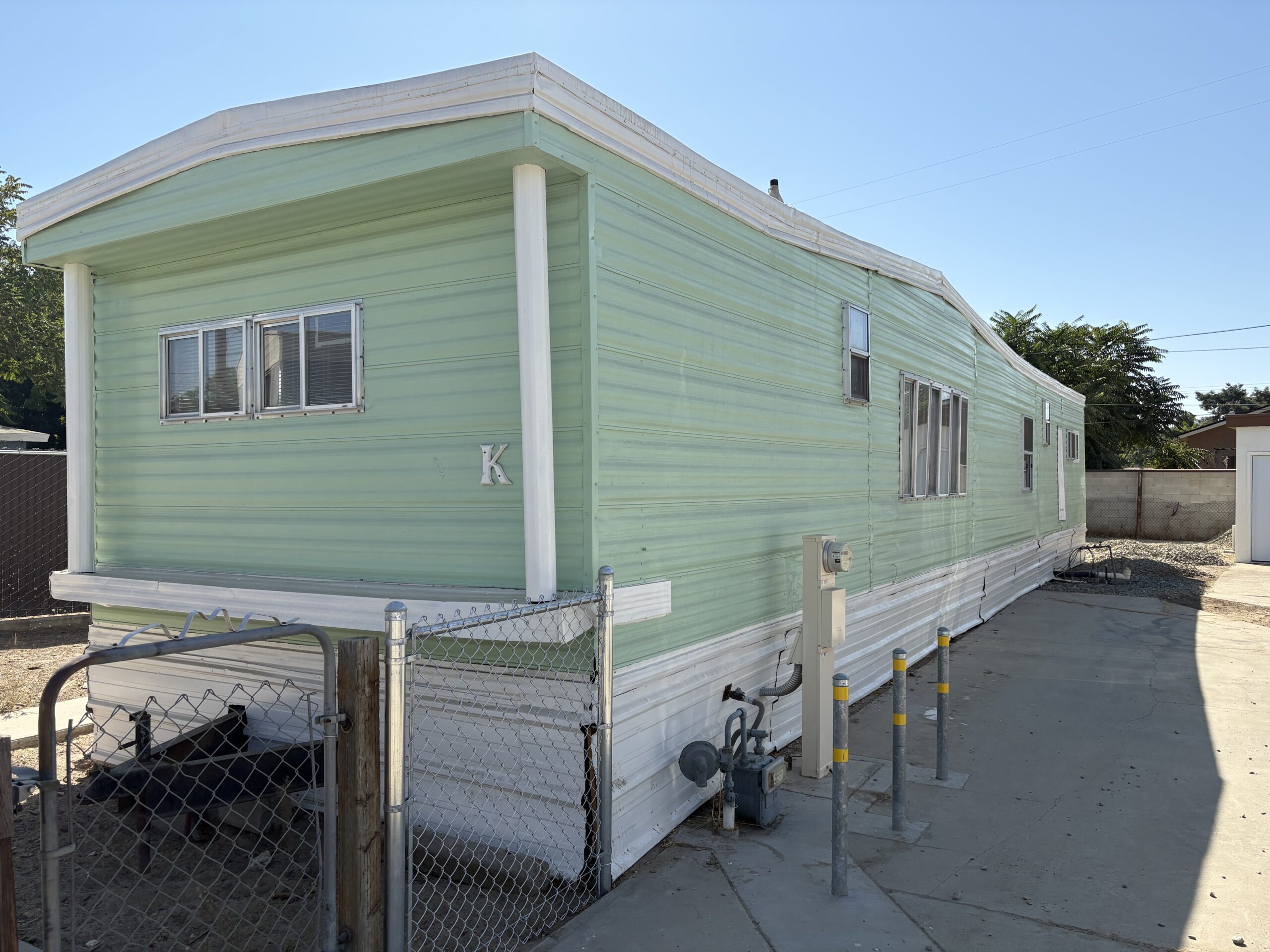Beige mobile home with brown shutters at Park View Mobile Home & RV Park in Fresno, CA, next to a paved driveway and a flowering bush, with a gas station visible in the background.